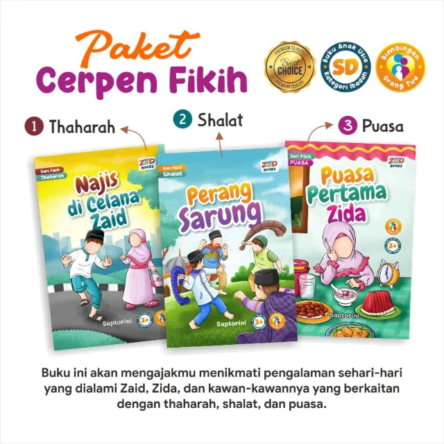 ✨Buku Paket Cerpen Fikih ini terdiri dari tiga buku dengan 3 tema: thaharah, shalat, dan puasa.